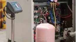 通過電子秤準(zhǔn)確補(bǔ)充液態(tài)制冷劑量;充注時(shí)請注意制冷劑瓶的方向。